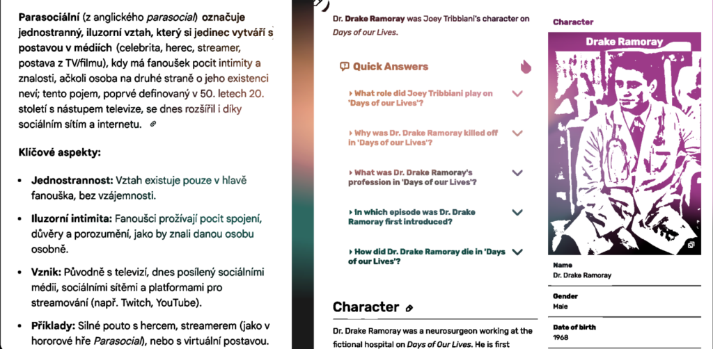 Během prvního hledání cílovky The Kardashians mi AI vyplivla celkem zajímavý termín „parasocial relationships“ ve vztahu k postavám pořadu. Což je jednostranný, iluzorní vztah, který si jedinec vytváří s postavou v médiích. Zatímco mediálně známá osoba ani netuší o existenci koncového konzumenta, ten zase má pocit, že o celebritě ví vše nebo hodně, což mu dává pocit blízkosti s dotyčným. Což je asi v pohodě, pokud je to v rámci zdravého rozumu, když prostě zanadáváte, že tamta je taková kráva, že ublížila tady ty. Ale bohužel jsou lidi, kteří tyto neexistující vztahy považuji za realitu. Mě se teď v hlavě vybavuje Joey z Přátel a jeho postava doktora Drakea Remoraye, a situace kdy nějaká fanynka postavy doktora měla pocit, že je její milý a nedokázala pochopit, že chudák to jenom hraje… sajko…. Ale tak, stává se všechno, hlavně včas vyhledat odborníka a víc chodit ven mezi opravdové lidí, že?